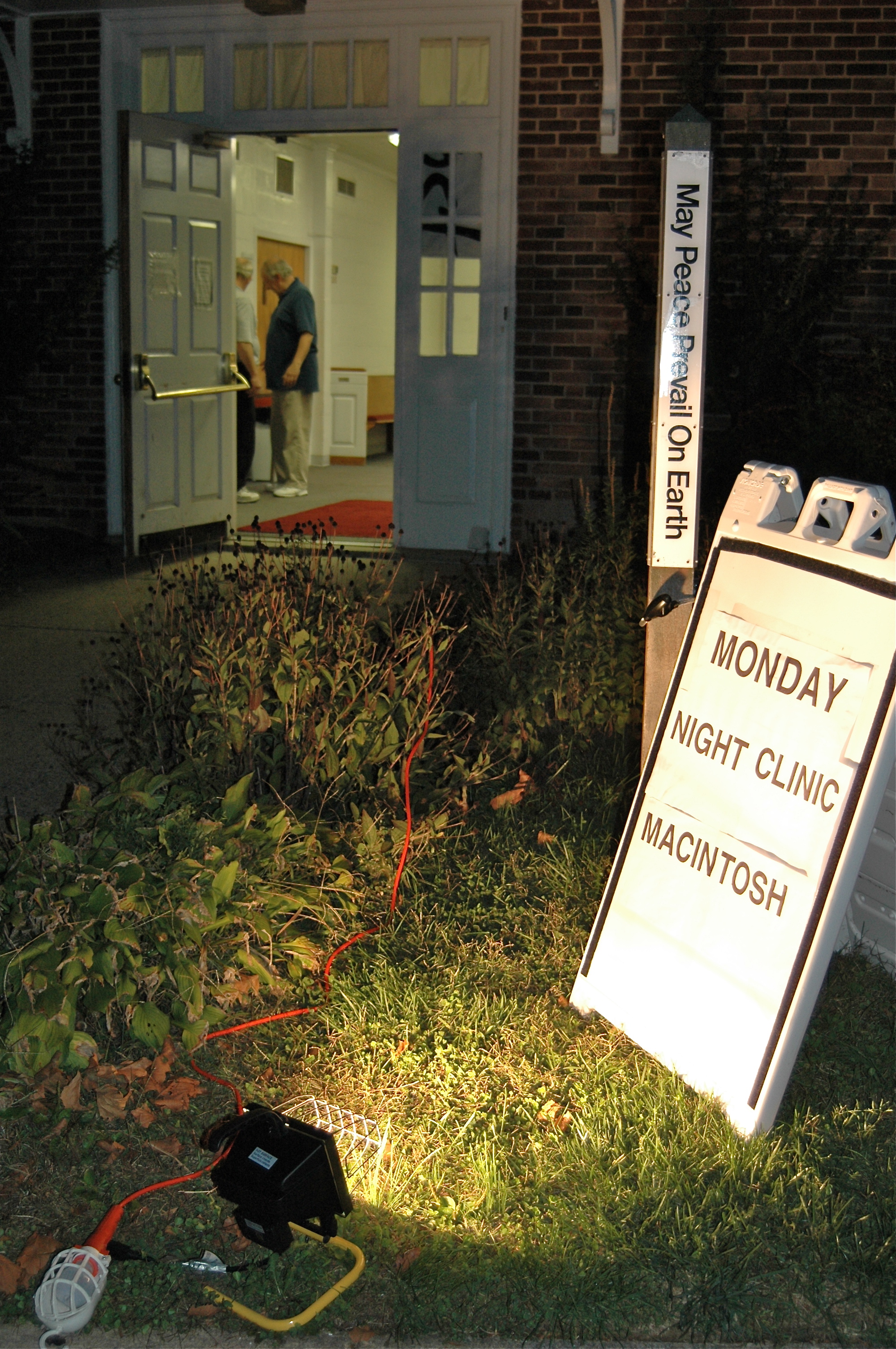 Marvin Memorial Methodist Church in Silver Spring. Drive in on this side - University Boulevard. There are two automobile entrances on this side and you'll exit from here as well. Parking lot is to the right of the church, with handicapped parking in front. Entrance to the Clinic is on the right side of the main church entrance. You will literally walk into the Clinic space - no climbing steps or long walks. If you have a heavy computer, come get us first and we'll help you bring your Mac in.